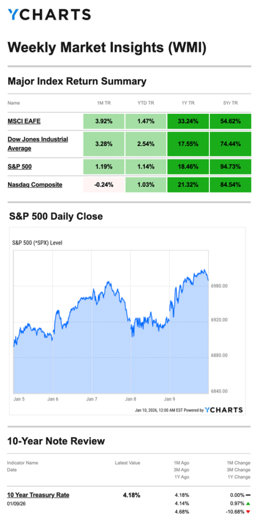 Source: YCharts.com, January 10, 2026. Weekly performance is measured from Monday, January 5, to Friday, January 9. TR = total return for the index, which includes any dividends as well as any other cash distributions during the period. Treasury note yield is expressed in basis points.