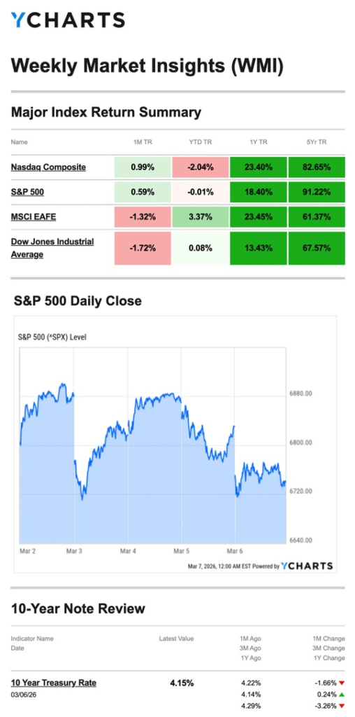 Source: YCharts.com, March 7, 2026. Weekly performance is measured from Monday, March 2, to Friday, March 6. TR = total return for the index, which includes any dividends and cash distributions during the period. Treasury note yield is expressed in basis points.