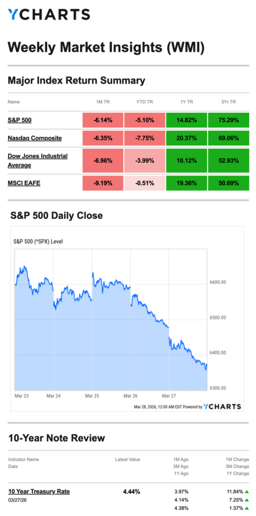Source: YCharts.com, March 28, 2026. Weekly performance is measured from Monday, March 23, to Friday, March 27. TR = total return for the index, which includes any dividends and cash distributions during the period. Treasury note yield is expressed in basis points.