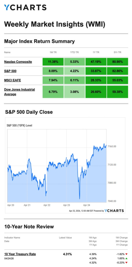 Source: YCharts.com, April 25, 2026. Weekly performance is measured from Monday, April 20, to Friday, April 24. TR = total return for the index, which includes any dividends and cash distributions during the period. Treasury note yield is expressed in basis points.